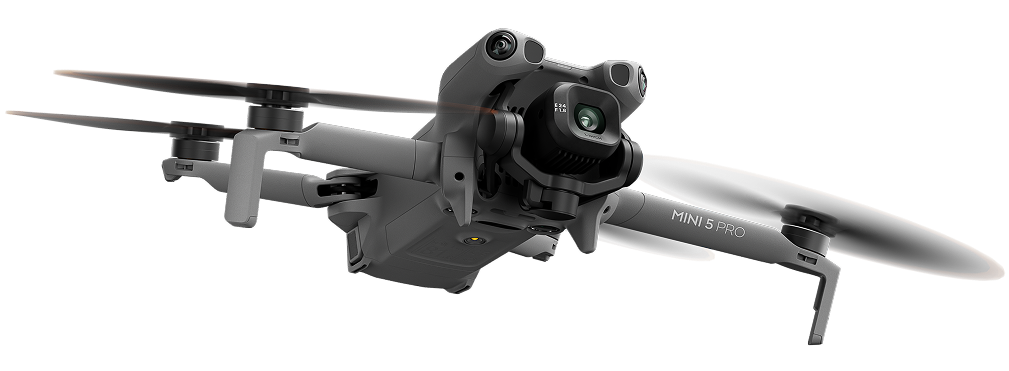 Equipado com um LiDAR frontal, o Mini 5 Pro apresenta lentes olho de peixe na frente e atrás para detecção para frente, para trás, para a esquerda, para a direita e para cima. A parte de baixo é equipada com lentes binoculares e um sensor infravermelho em 3D, entregando detecção de obstáculos omnidirecional.
